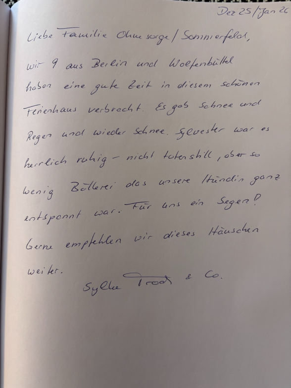wir 9 aus Berlin und Wolfenbüttel haben eine gute Zeit in diesem Ferienhaus verbracht. Es gab Schnee und Regen und wieder Schnee. Sylvester war es herrlich ruhig – nicht totenstill, aber so wenig Böllerei, dass unsere Hündin ganz entspannt war. Für uns ein Segen. Gerne empfehlen wir dieses Häuschen weiter.