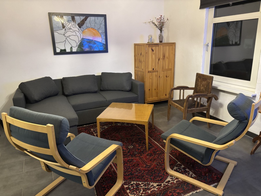 Neben dem Essbereich befindet sich das Wohnzimmer. Die Couch lässt sich auf eine Fläche von 1,50 x 1,90 m als Schlafplatz für zwei Personen ausziehen. Das Wohnzimmer ist mit einem Kaminofen, einer